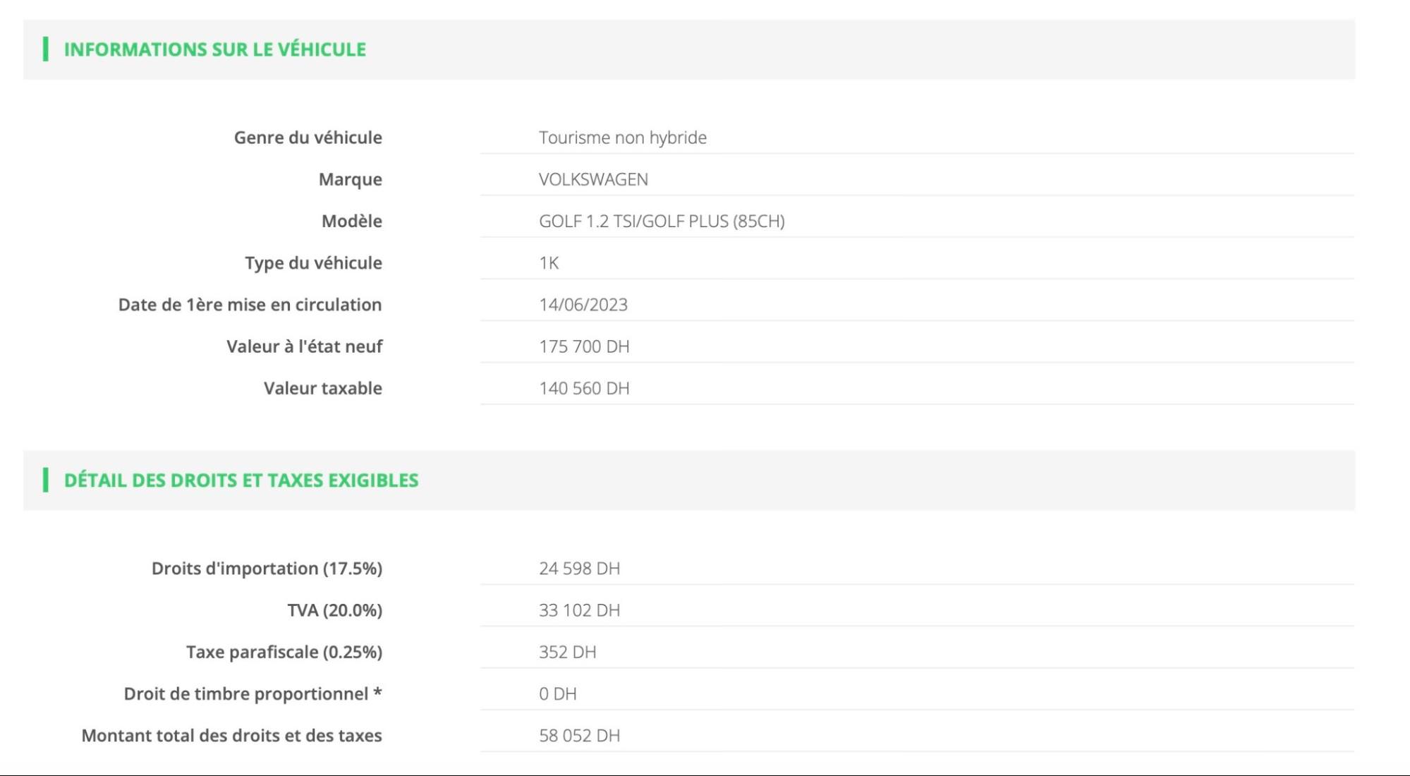 There, you’ll enter the car details and you’ll get the estimated import taxes. Here’s what the taxes would look like for a VW Golf 1.2 TSI registered in 2023.